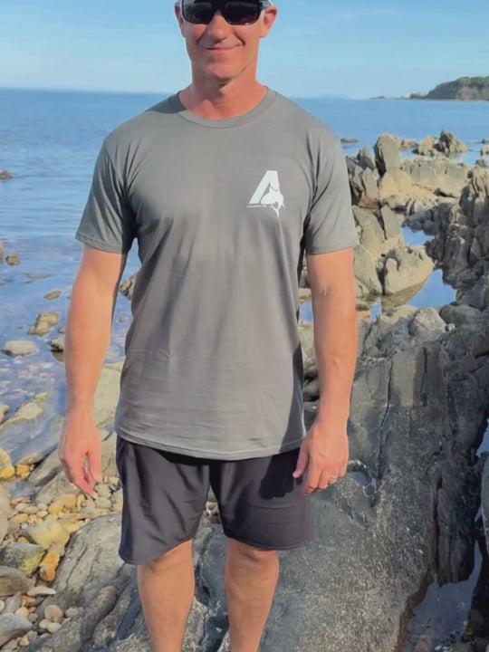 Charcoal coloured short sleeve cotton t-shirt hand printed with a Giant Trevally image on the back and Anchorline Australia logo on the front.