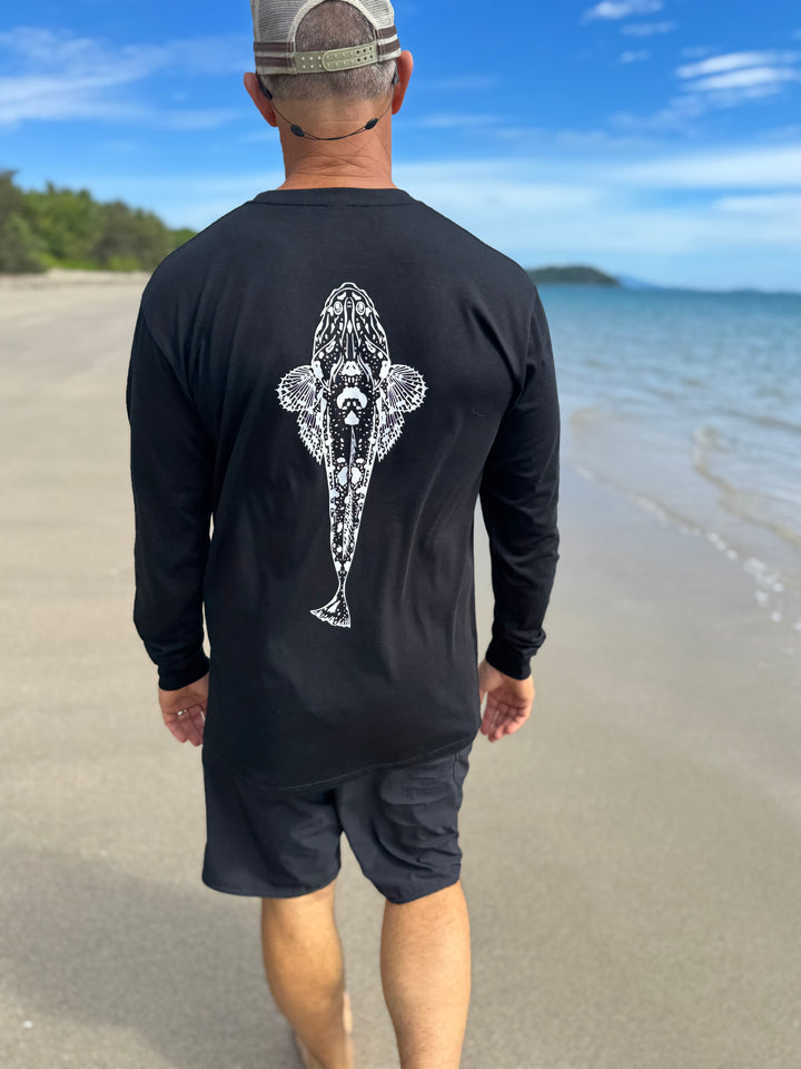 Black men's long sleeved cotton t-shirt hand printed with a white Flathead print on the back and a small logo on the front. The perfect t-shirt for that slightly cooler weather or everyday wear in the sun.